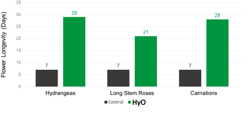 Under both scenarios above, all flowers tested lasted significantly longer in HyO water, suggesting preservatives and coolers set at 40 degrees, may no longer be needed.